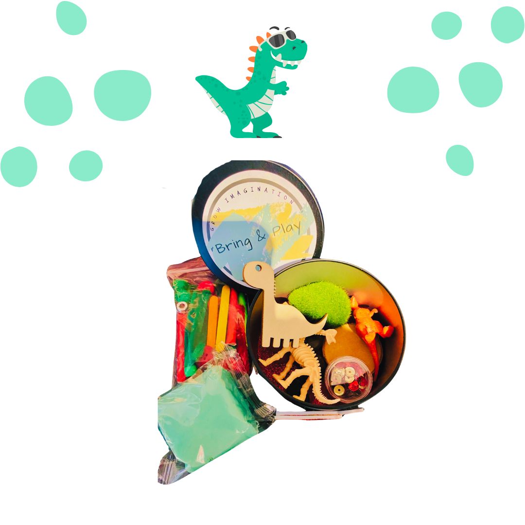 This kit contains non-toxic soft playdough, pom poms, straws, pipe cleaners, buttons, beads, wooden sticks, x 1 dinosaur, x1 dino fossil, x 1 moss, x 3 pebbles, x 2 glass stones, x 1 piece of wood and a mini wooden dino.
