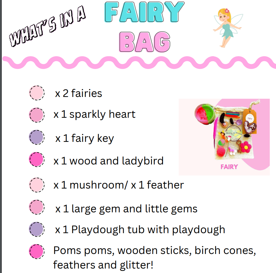 The Fairy bag includes a fairy, gems, a wooden key, ladybird, glitter and more!